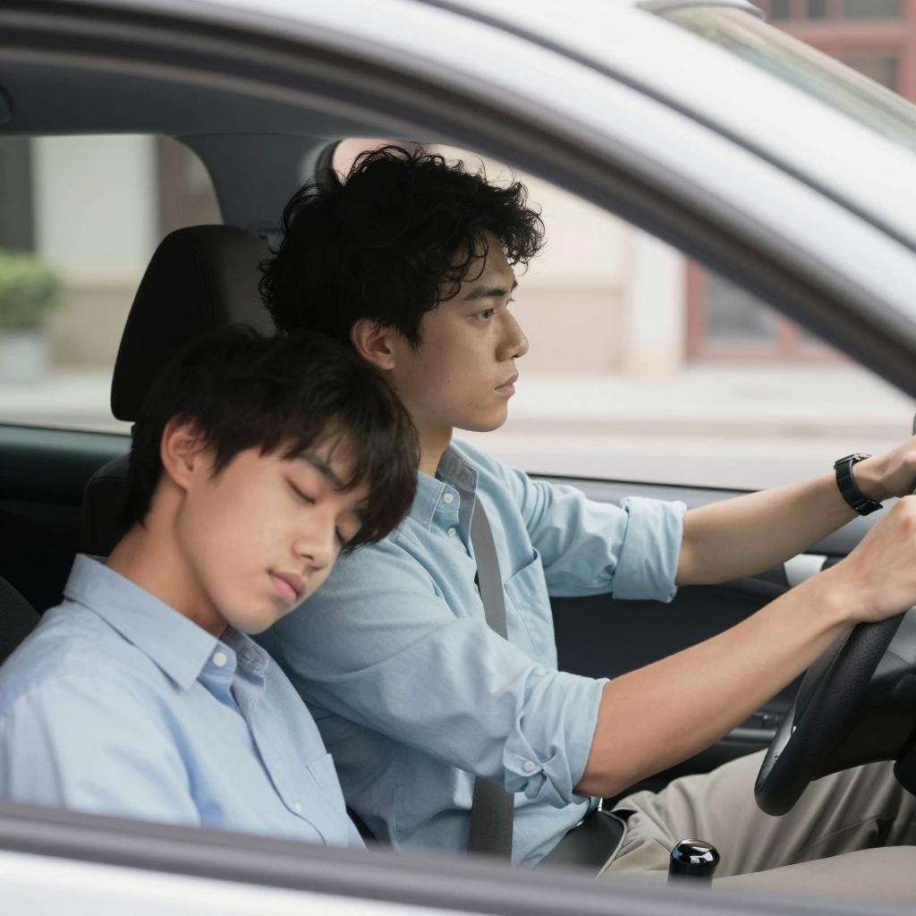 Two people in a car. Young man in red backward cap, yellow shirt, plaid shirt, seatbelt, looking down. Woman with short brown hair, white blouse, necklace, looking ahead. Green foliage outside car window. Man on left, woman on right. Both have neutral expressions.