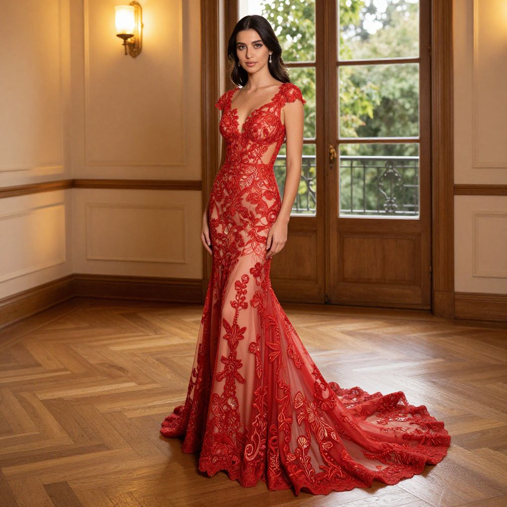 Photograph of a confident woman with long, wavy black hair, wearing a form-fitting, floor-length red lace gown with a deep V-neck and sleeveless design. The gown features intricate floral lace patterns and a long, trailing train. She stands in an elegant room with wooden parquet flooring and cream-colored walls. Large windows with black wrought iron bars and a golden-framed mirror are in the background. Warm, soft lighting enhances the luxurious ambiance. She wears large, dangling earrings, adding to her glamorous appearance.