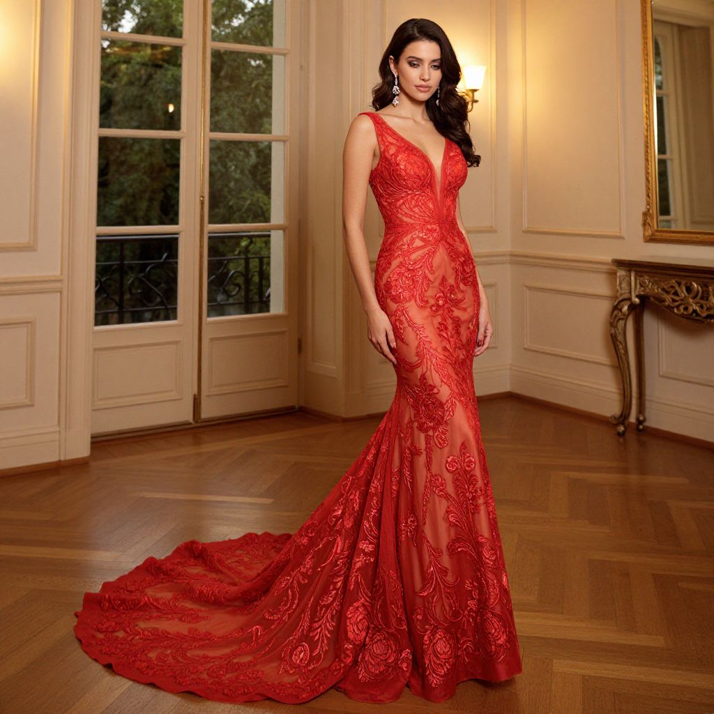 Elegant woman standing gracefully in a vibrant red lace gala evening gown, featuring intricate floral embroidery and a flowing train, illuminated by warm ambient lighting in an opulent room with wooden parquet flooring and a large window revealing greenery outside.