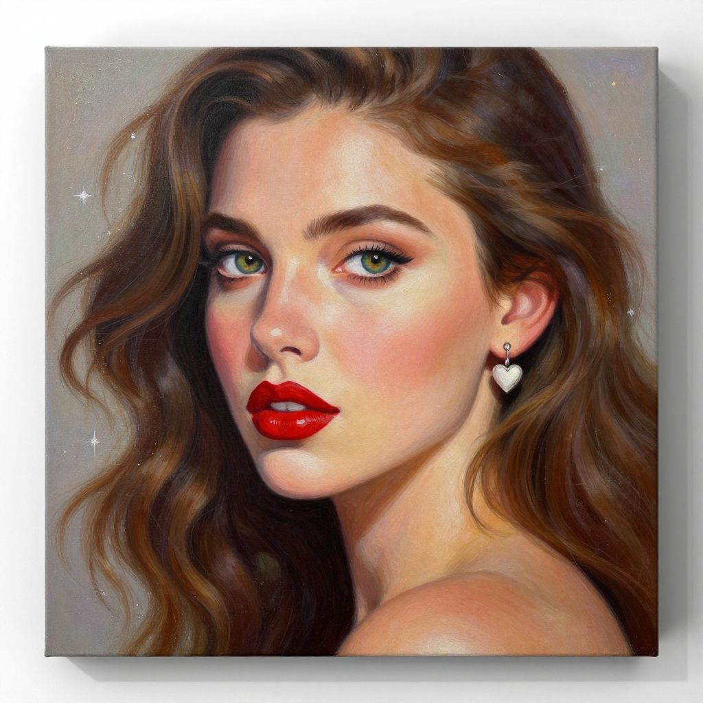 Canvas oil painting featuring a woman with vibrant red lips, striking green eyes, and wavy brown hair, adorned with a small heart-shaped earring, set against a soft, starry background.