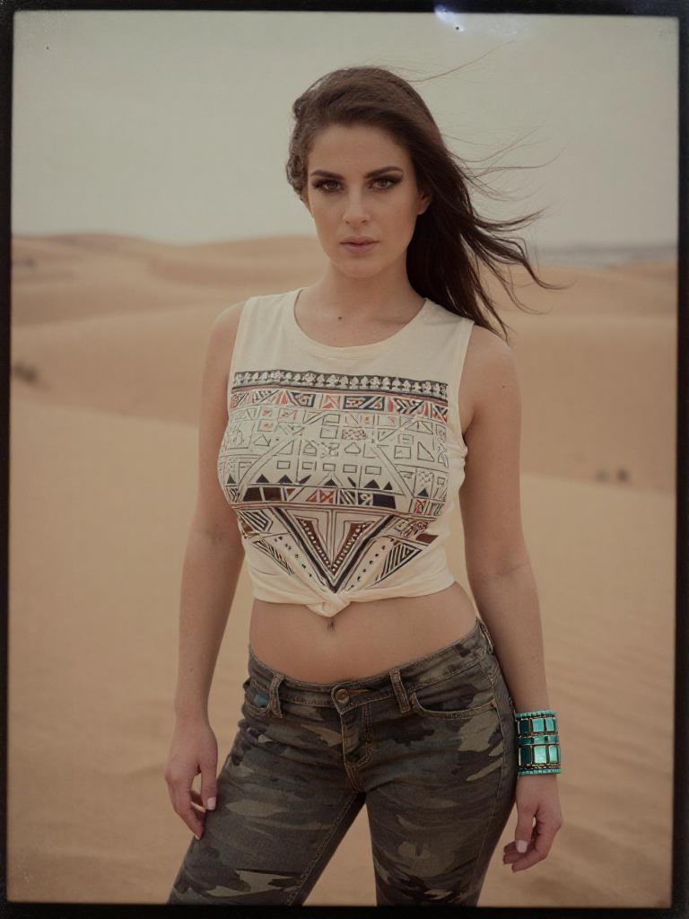 A Svelte woman in a sleeveless cream tank top with geometric print and low-rise camouflage skinny jeans, accessorized with a chunky turquoise bracelet, captured in the visual style of a Collodion wet plate, standing at a desert dune with a mirage. Sexy. Pretty face and beаutiful eyes. Big breasts