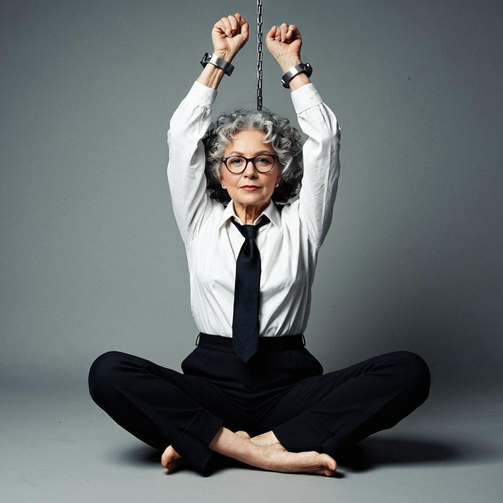 Portrait of a confident older woman with salt and pepper waves hairstyle, wearing a ruffled crochet blouse and black studio flare leather trousers. She is styled with heeled leather boots and a wide-brimmed black hat, standing against a striped light-colored backdrop, showcasing a retro 1970s fashion vibe.