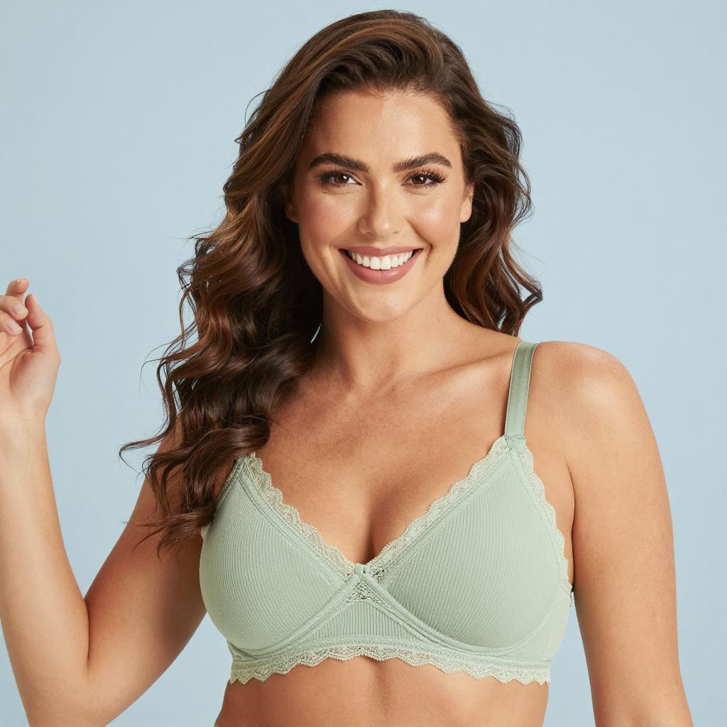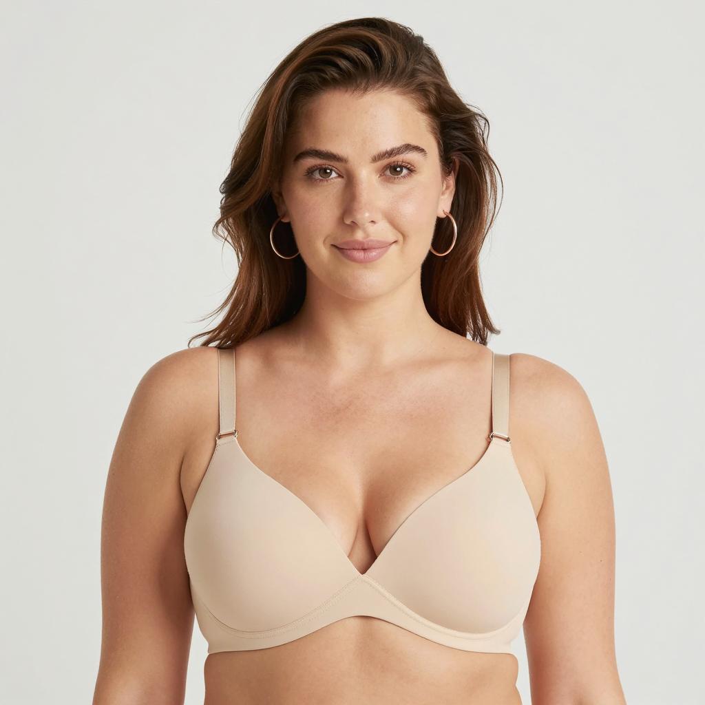 Blonde woman with wavy hair, wearing a tan straw hat and dark blue sports bra with a circular ring detail. She has light skin, large breasts, and is smiling. She stands against a plain beige background. Her right arm rests on her hip. She wears large hoop earrings. The image is a photograph.