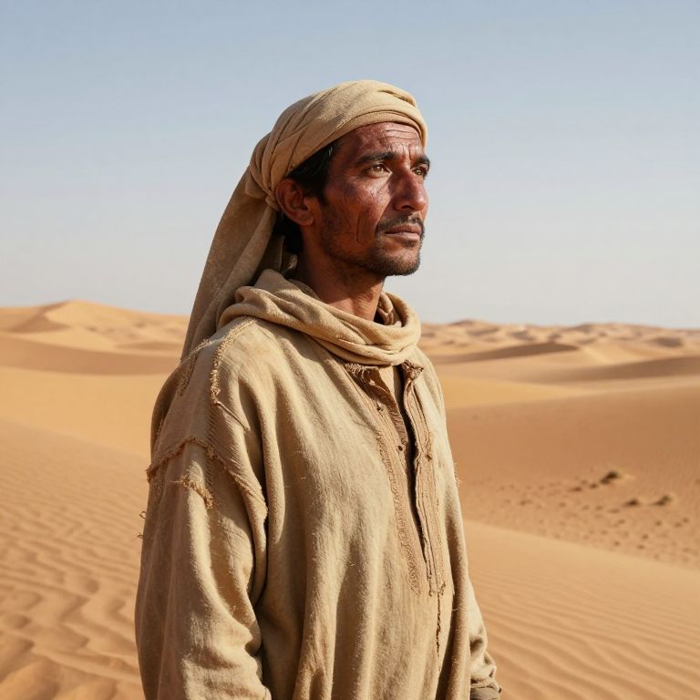Photograph of a middle-aged, dark-skinned man with a weathered face, wearing a beige hooded robe and matching headscarf. His face is smeared with dust and sweat, and he has a thin mustache. He stands in a vast, sunlit desert with rippled sand dunes stretching into the horizon under a clear blue sky. The lighting casts sharp shadows, highlighting the texture of his clothing and the sand. The man's expression is serious and contemplative, as he looks to the right. The scene is bathed in warm, natural light.