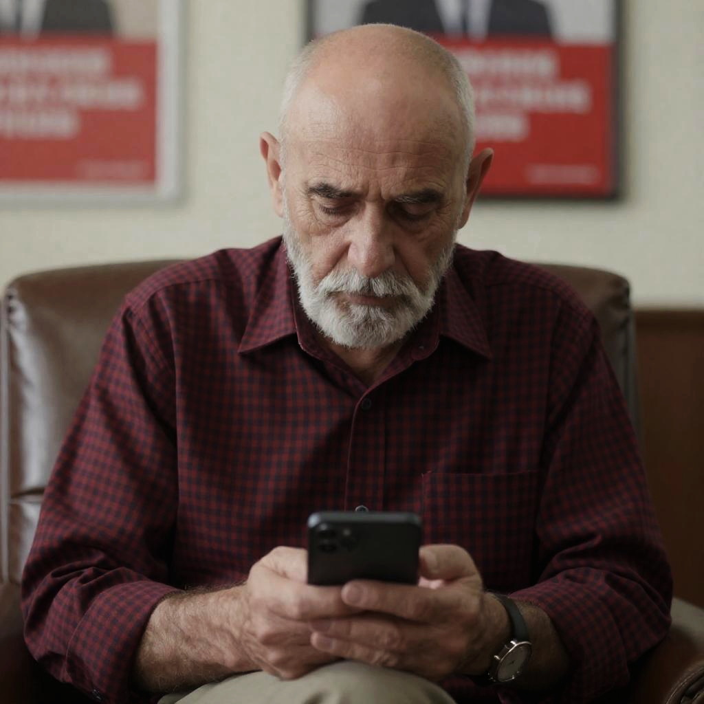 Photograph of an elderly man with a bald head and white beard, wearing a red and black checkered shirt, sitting in a brown leather chair, intently looking at a smartphone. Background has blurred red and white posters.
