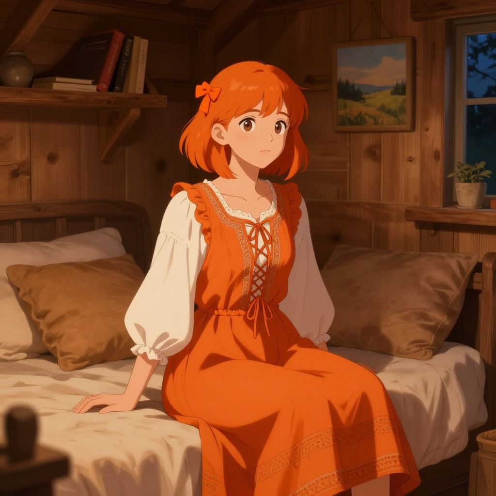 Realistic illustration of a girl with short orange hair and an orange hair ribbon, sitting on a bed in a warm-toned rustic cabin. She wears a chic bohemian orange dress with lace-up front and a white blouse underneath. The background features wooden panel walls, pillows, and eclectic bookshelves with books and a framed landscape painting, creating a cozy twilight ambiance.