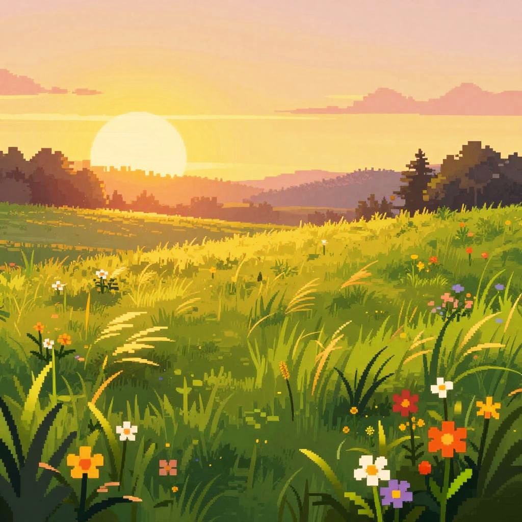 Stardew Valley grass swaying gently in a golden sunset, lush green meadow with wildflowers, vibrant pixel art style, peaceful rural farm atmosphere, soft warm lighting