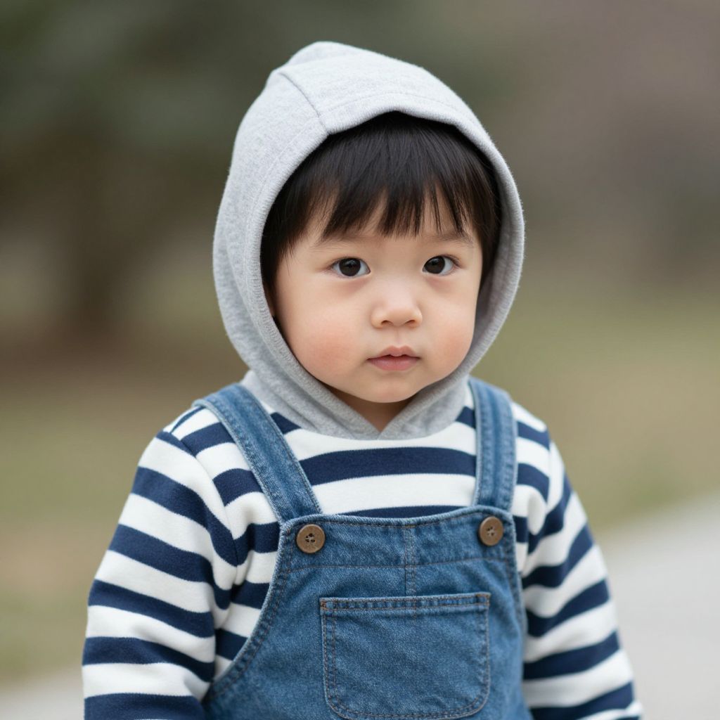Photograph of an Asian toddler with fair skin and black hair, wearing a grey hooded sweatshirt and blue denim overalls over a white and navy striped shirt. The child has large, dark eyes and a neutral expression, standing outdoors with a blurred green and brown background. The overalls have brown buttons, and the hood of the sweatshirt is partially up. The image focuses on the child from the waist up, capturing a soft, natural light. The overall composition is centered, creating a calm and innocent atmosphere.