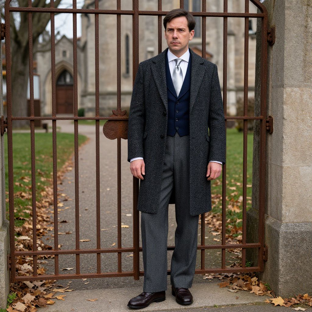 Photograph of a serious-looking Caucasian man standing in front of an iron gate in a historic, stone-walled courtyard. He has short, dark hair and wears a black overcoat over a white dress shirt, black waistcoat, and grey trousers. His black shoes are polished. The background includes a grassy area with scattered fallen leaves and a stone building with arched windows. The gate is rusty, with vertical and horizontal bars. The overall color palette includes muted greys, blacks, and browns, reflecting an autumn setting. The man's posture is straight and formal.