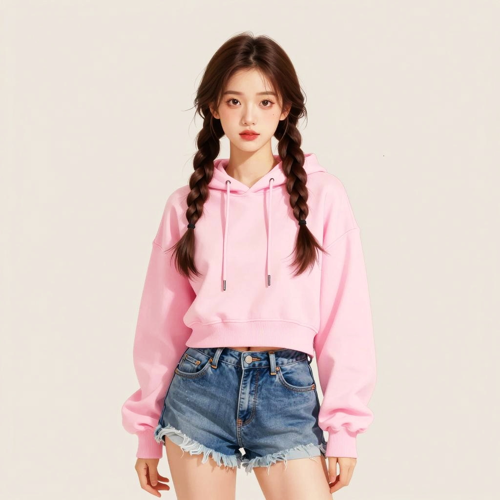 This digital illustration features a young woman with braided pigtails dressed in a pink hoodie and denim shorts, exuding a casual, youthful vibe. The artwork showcases a detailed, semi-realistic style with soft shading and clean lines, set against a textured beige background with paint splatters that add an artistic flair.