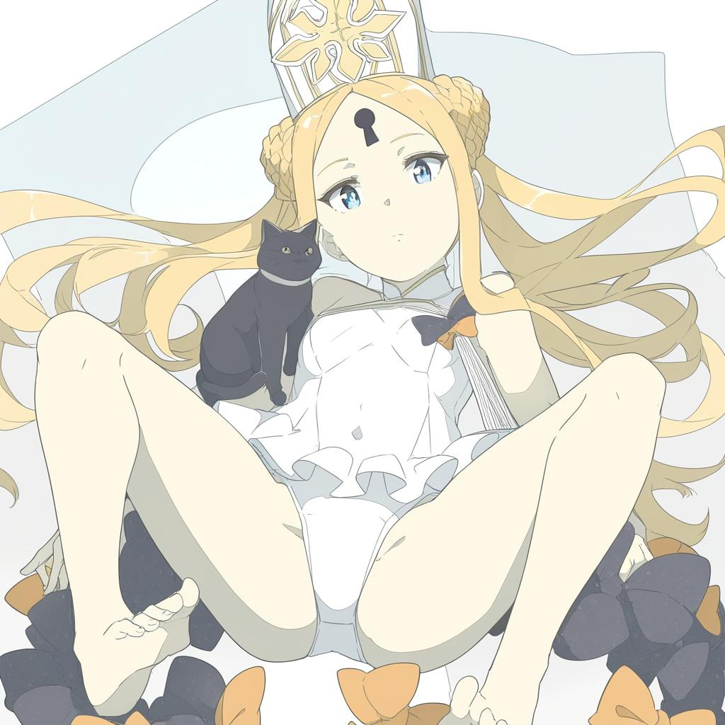 Abigail williams (swimsuit foreigner) (second ascension) (fate), fate/grand order, 1girl, blue eyes, blonde hair, very long hair, parted bangs, sidelocks, double bun, twintails, braided bun, small breasts, thighs, covered navel, white one-piece swimsuit, dress swimsuit, white headwear, bare shoulders, orange bow, black bow, multiple bows, forehead, black cat, keyhole, mitre, white hat, by artist ninimo nimo, leet