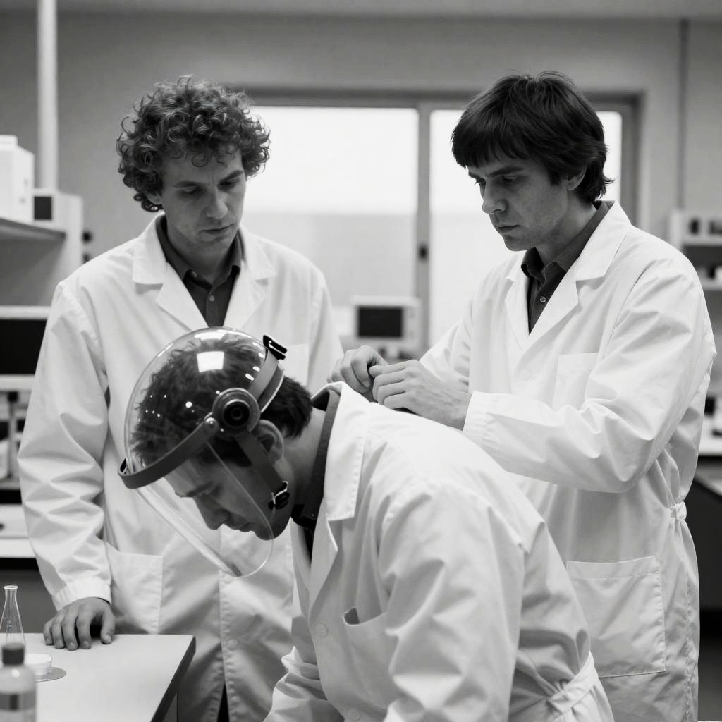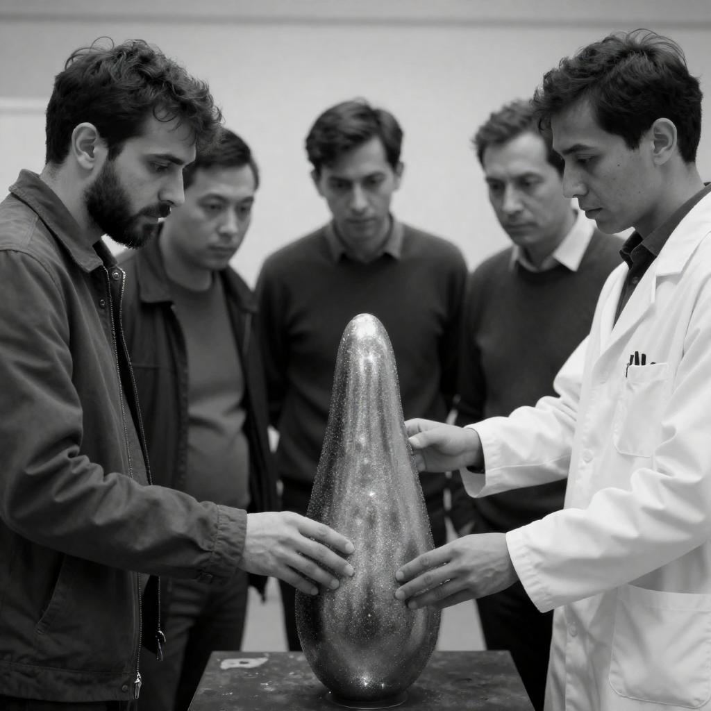 Black-and-white photograph of five men examining a large, ured object. Leftmost man with beard, rightmost man with dark hair in lab coat. Men in jackets and sweaters. Intense expressions. Object in center, sparkly and elongated. Indoor setting.