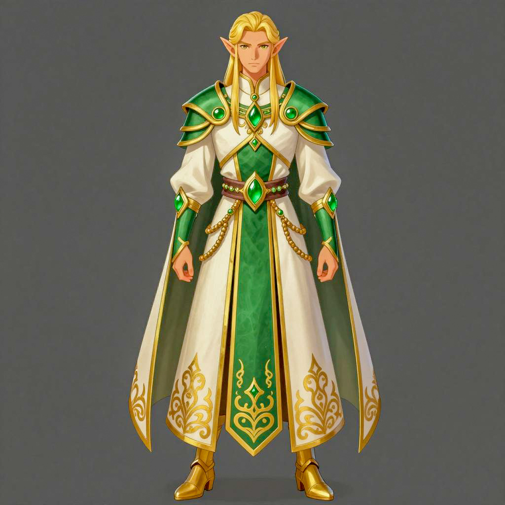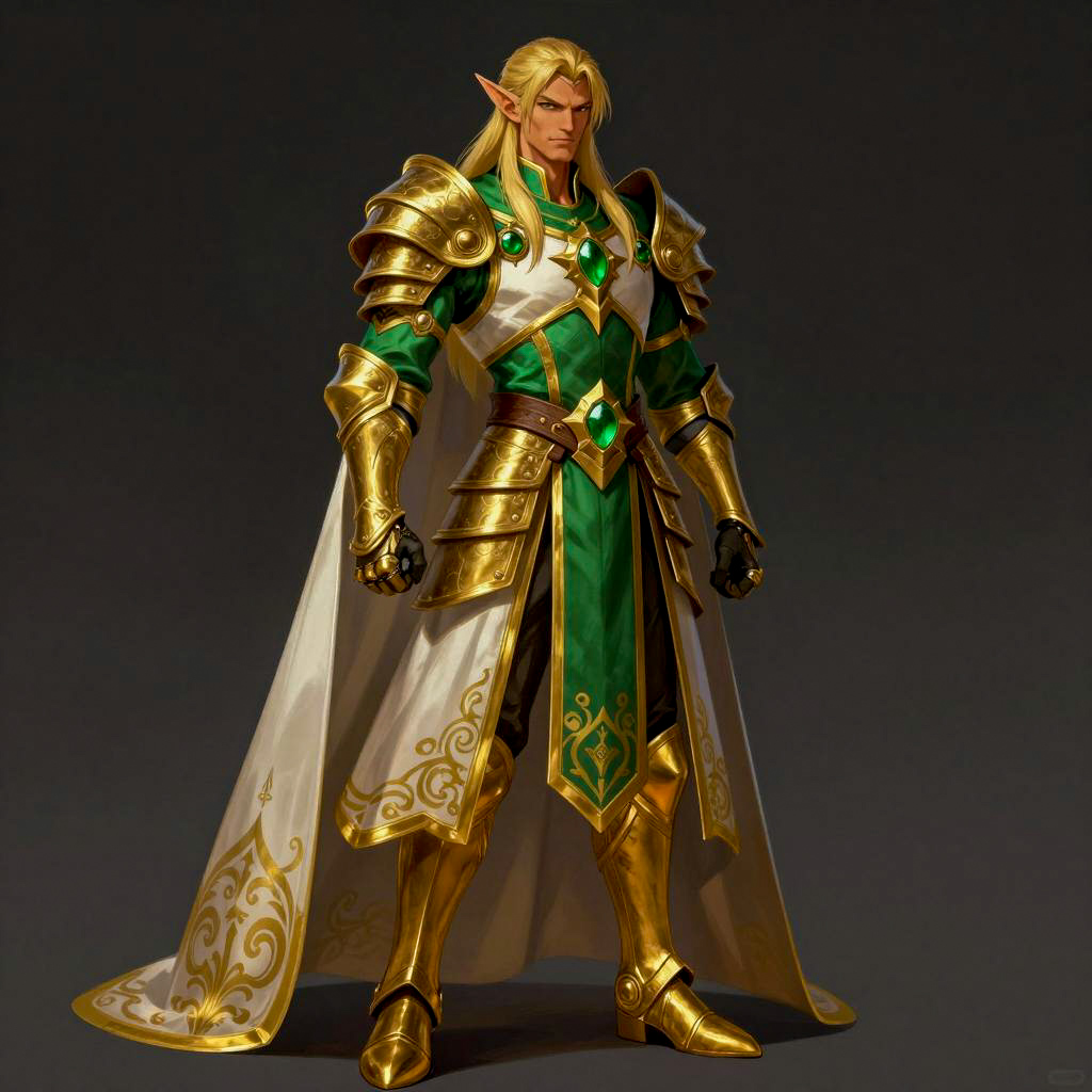 Epic fantasy illustration of a tall, muscular elf with long, blonde hair and pointed ears. He's wearing ornate green and gold armor with intricate designs, a green gem at the chest, and a long white robe with gold patterns. His serious expression is intense. He stands with a slight forward lean, hands by his sides. Dark background. His golden boots match his armor. No visible or .