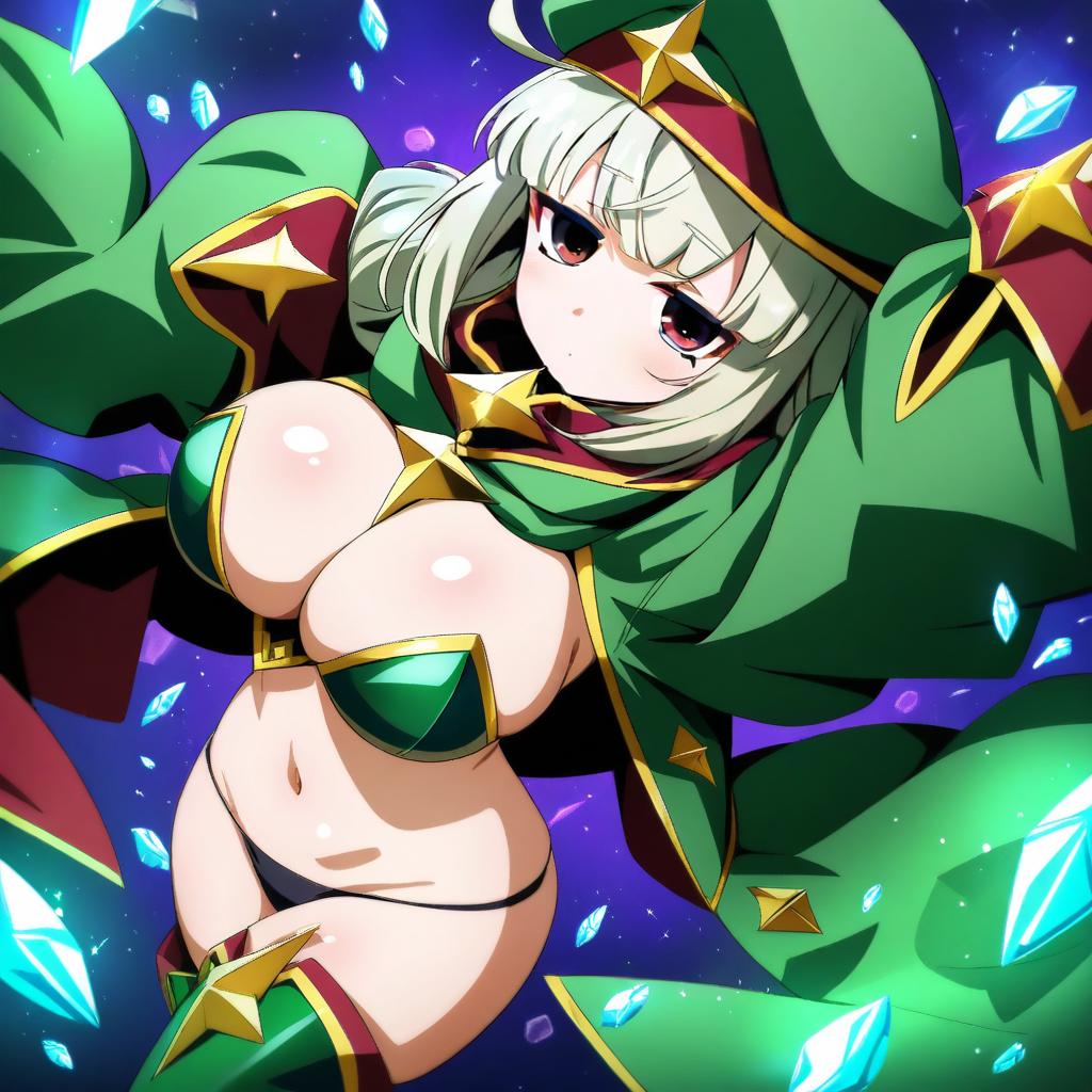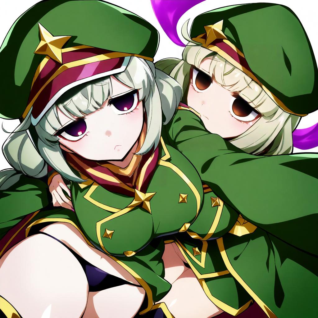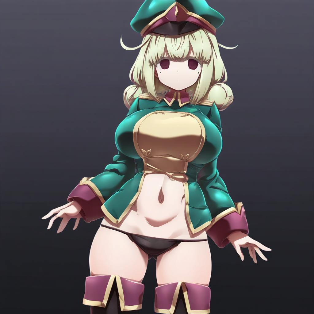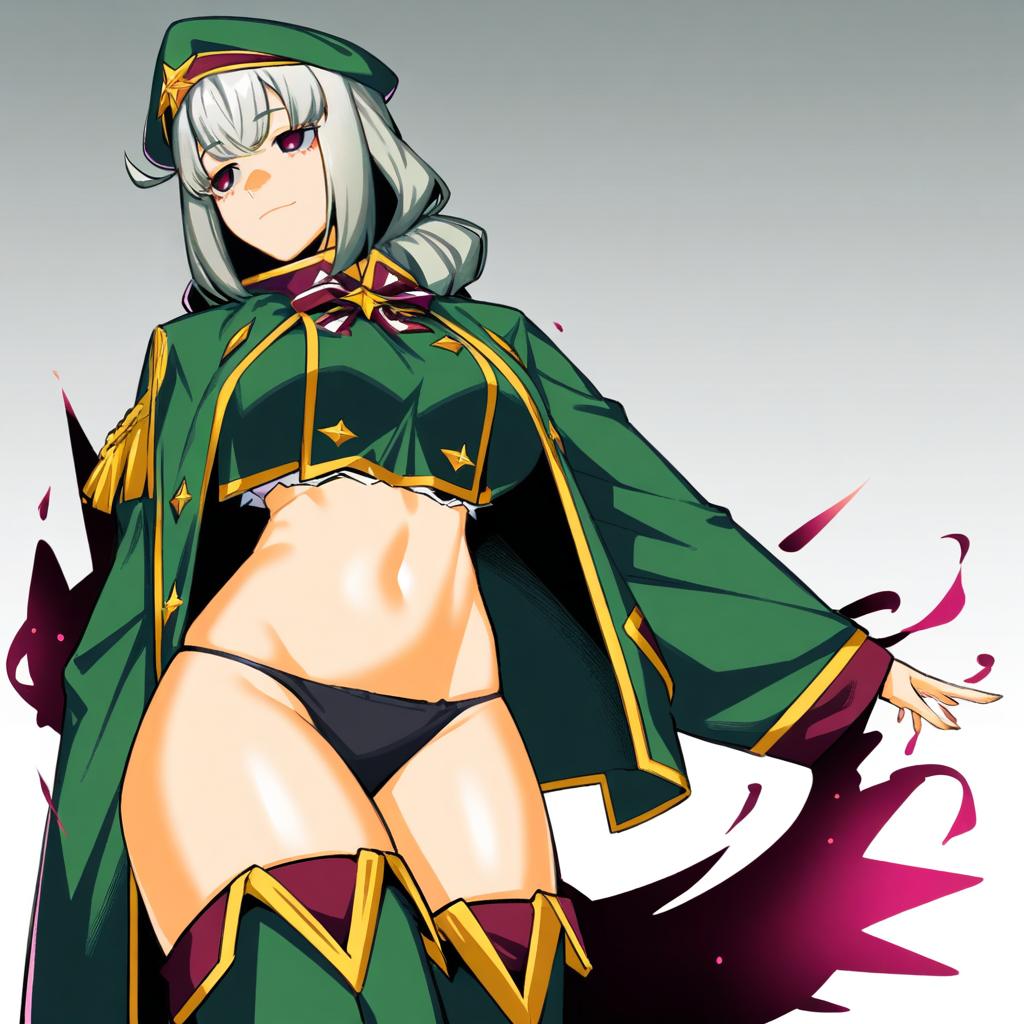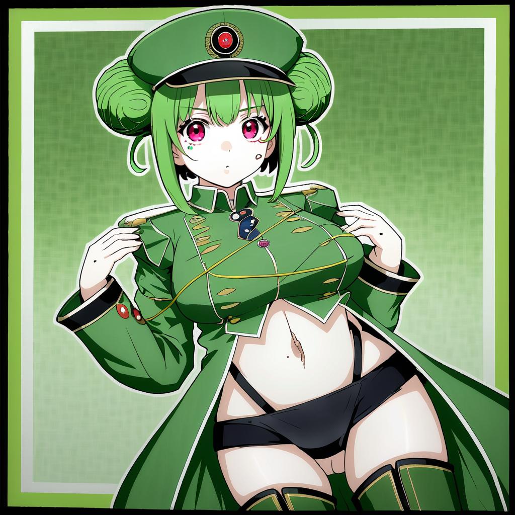 Araga kiwi, mahou shoujo ni akogarete, 1girl, red eyes, purple eyes, empty eyes, mole under eye, green hair, medium hair, double bun, large breasts, navel, thigh boots, black panties, green jacket, green headwear, military hat, long sleeves, by artist avogado6, animagine