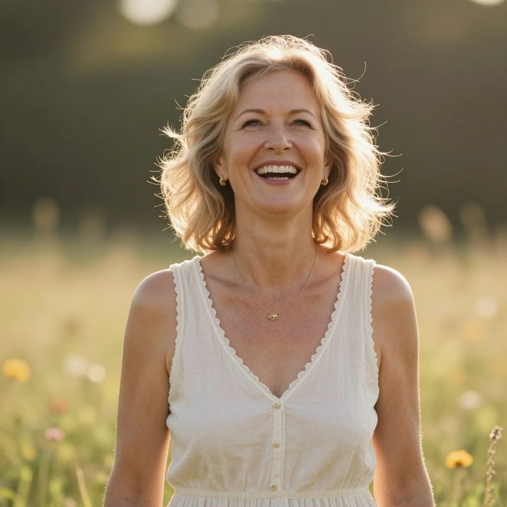Radiant serenity envelops a mature woman in a sunlit meadow, her laughter echoing like a gentle breeze, symbolizing the timeless embrace of nature and the enduring spirit of joy.