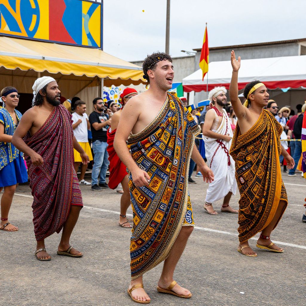 Togas depicted in a dynamic carnival scene, colorful festival atmosphere with people dancing and celebrating in elaborate outfits, confetti in the air, vibrant fabric colors with traditional Roman patterns, expressive faces, lively and festive composition