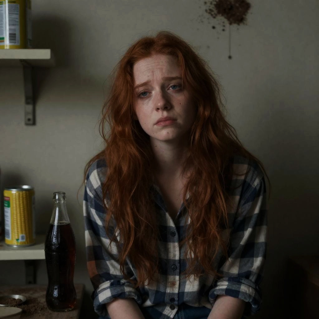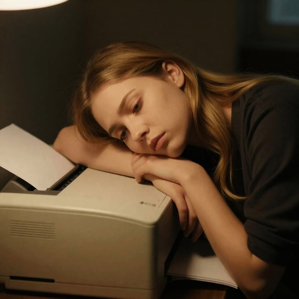 Photograph of a tired young woman with light skin and long, blonde hair, leaning her head on an old-fashioned, beige printer. She wears a dark shirt and rests her chin on her hand. The printer is illuminated by warm, yellow lighting. Her expression is somber and exhausted. The background is dark, emphasizing her and the printer.