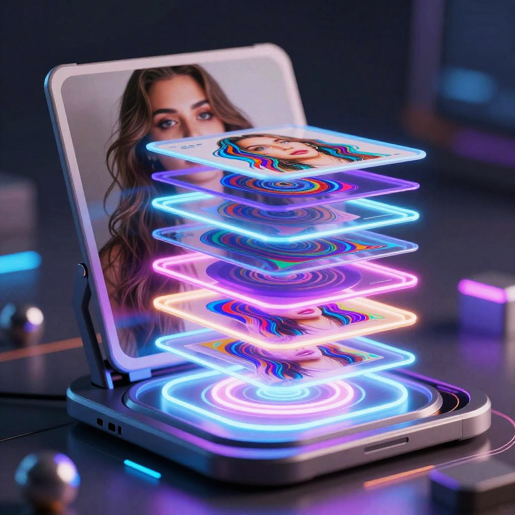 AI your photo visualization: a dynamic image of a photo being processed by AI, showing transformation layers from raw image to AI generated artwork, vibrant neon glow effects, 3D holographic layers projecting from the photo, sleek tech interface, immersive futuristic ambiance