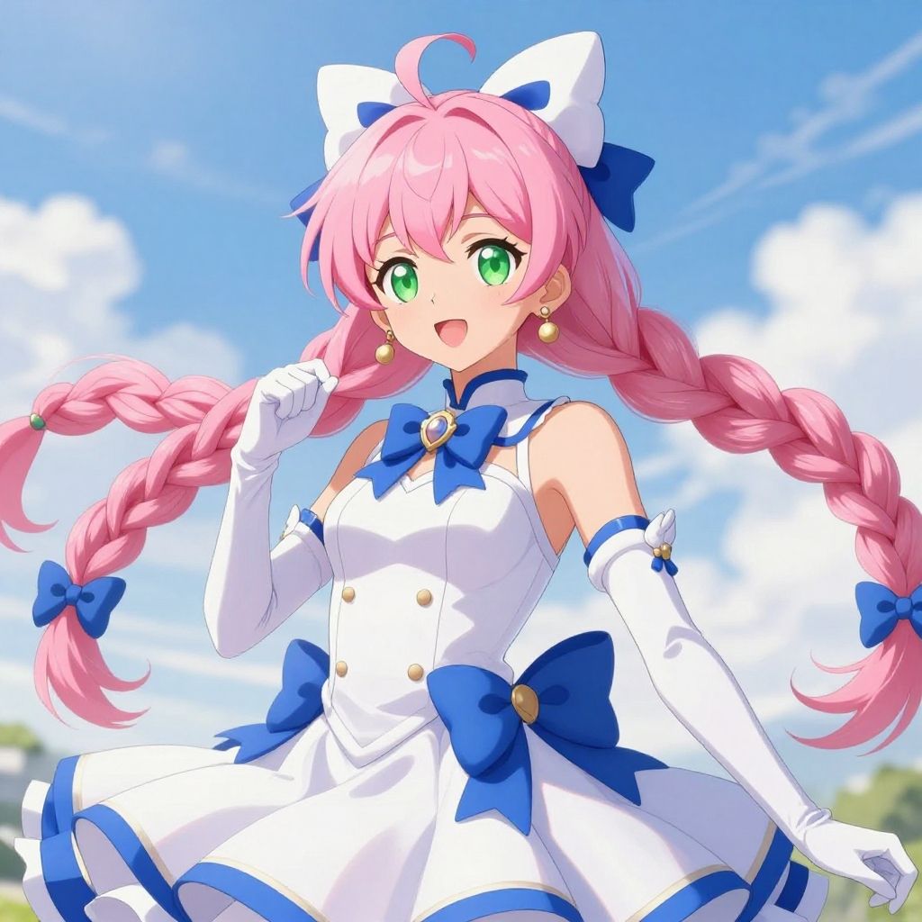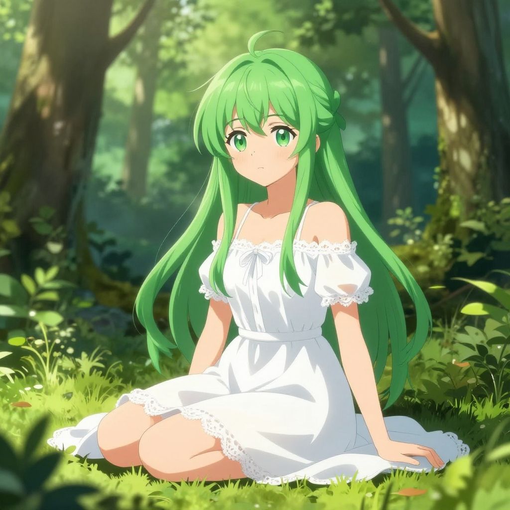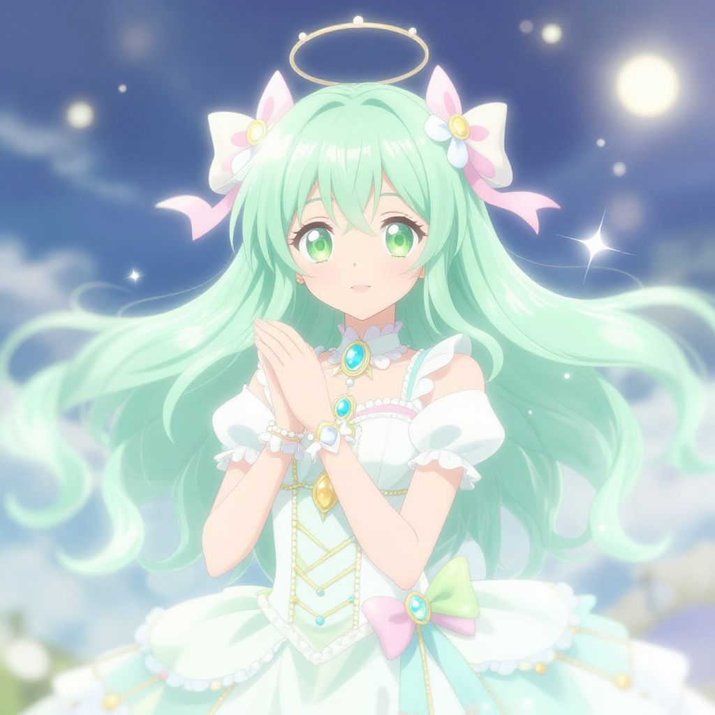 Anime with green hair, magical girl theme, sparkling aura, pastel colors, whimsical costume with ribbons and jewels, dreamy background with floating lights, soft focus