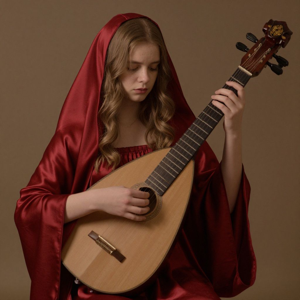 Enveloped in the warmth of rich crimson silk, a young woman cradles her lute, her fingers poised in a delicate dance of sound and emotion, evoking a timeless melody that whispers of longing and serenity.