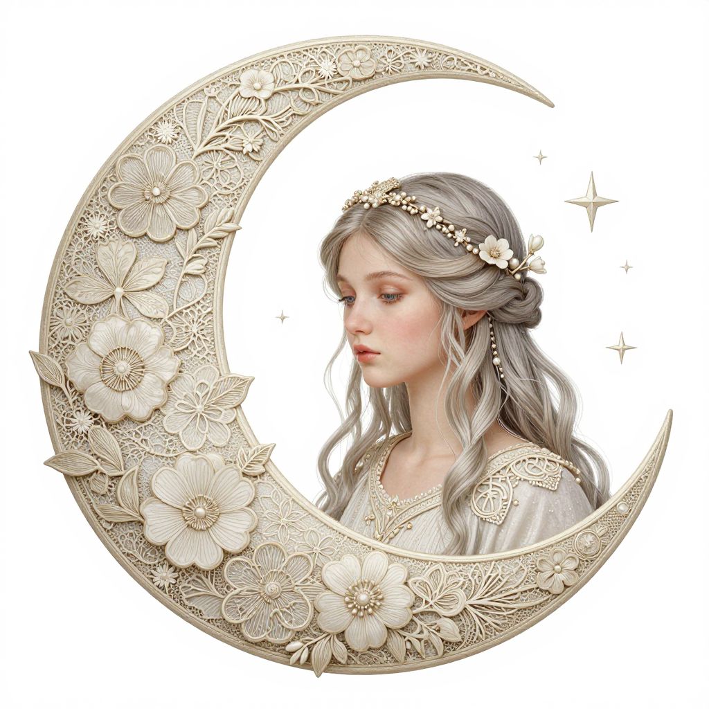 Digital illustration of a fair-skinned, young woman with long, wavy, silver-gray hair adorned with a floral headband. She wears an intricately detailed, white lace dress with floral patterns. The background features a large, ornate, crescent moon decorated with large, white, floral patterns. The woman gazes downward with a serene expression. Small, glowing stars are scattered around her right side. The overall style is fantasy, with a whimsical, ethereal feel, and the color palette is predominantly white and silver. The image has a clean, white background, emphasizing the detailed, ornate elements.