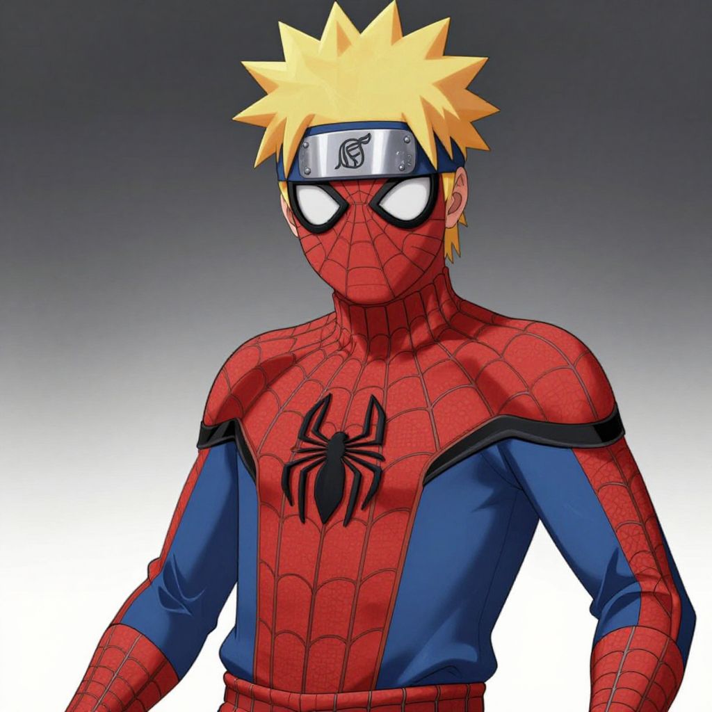 Digital artwork of Naruto Uzumaki in a Spider-Man costume, featuring red spider web suit, blue accents, and spider emblem, with blonde spiky