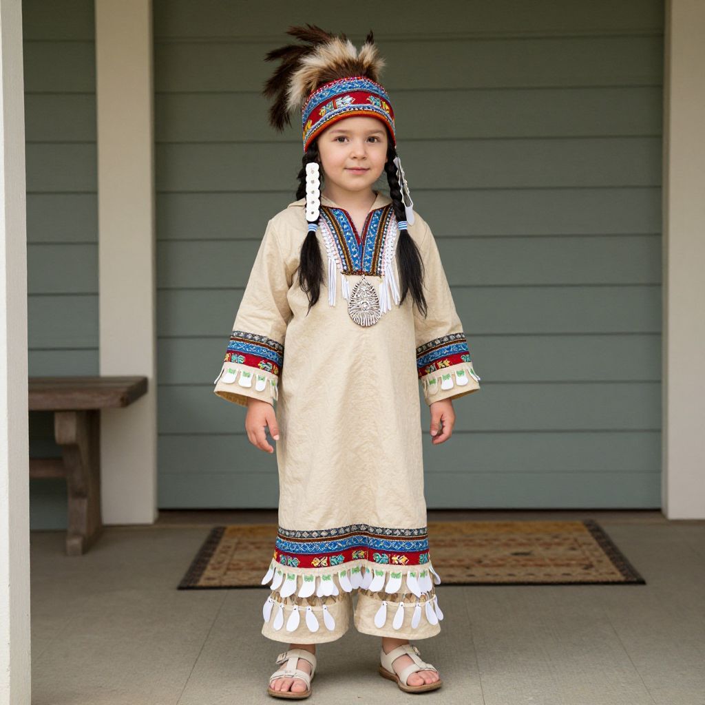 Kid Grandma Costume, toddler dressed in native american clothing standing on a porch