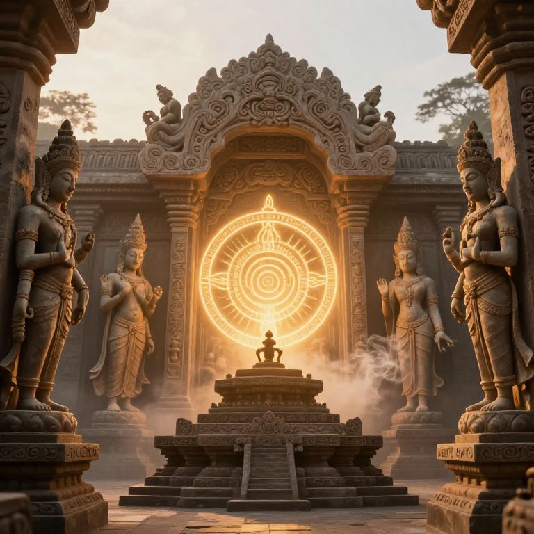 God images prompt: A mystical, ancient temple bathed in golden hour light, with intricate carvings of deities surrounding a central pedestal featuring a glowing divine symbol, ethereal smoke rising from the stone, dreamy atmosphere, high-detail, cinematic composition, Flux style.