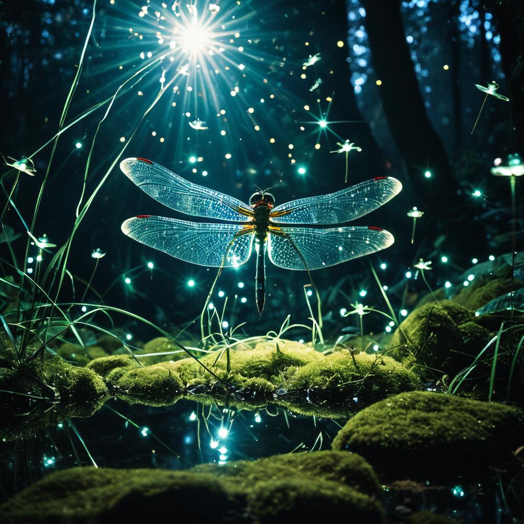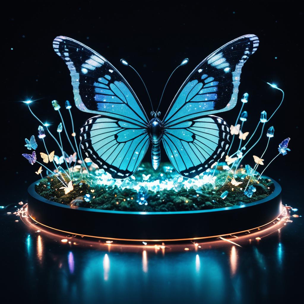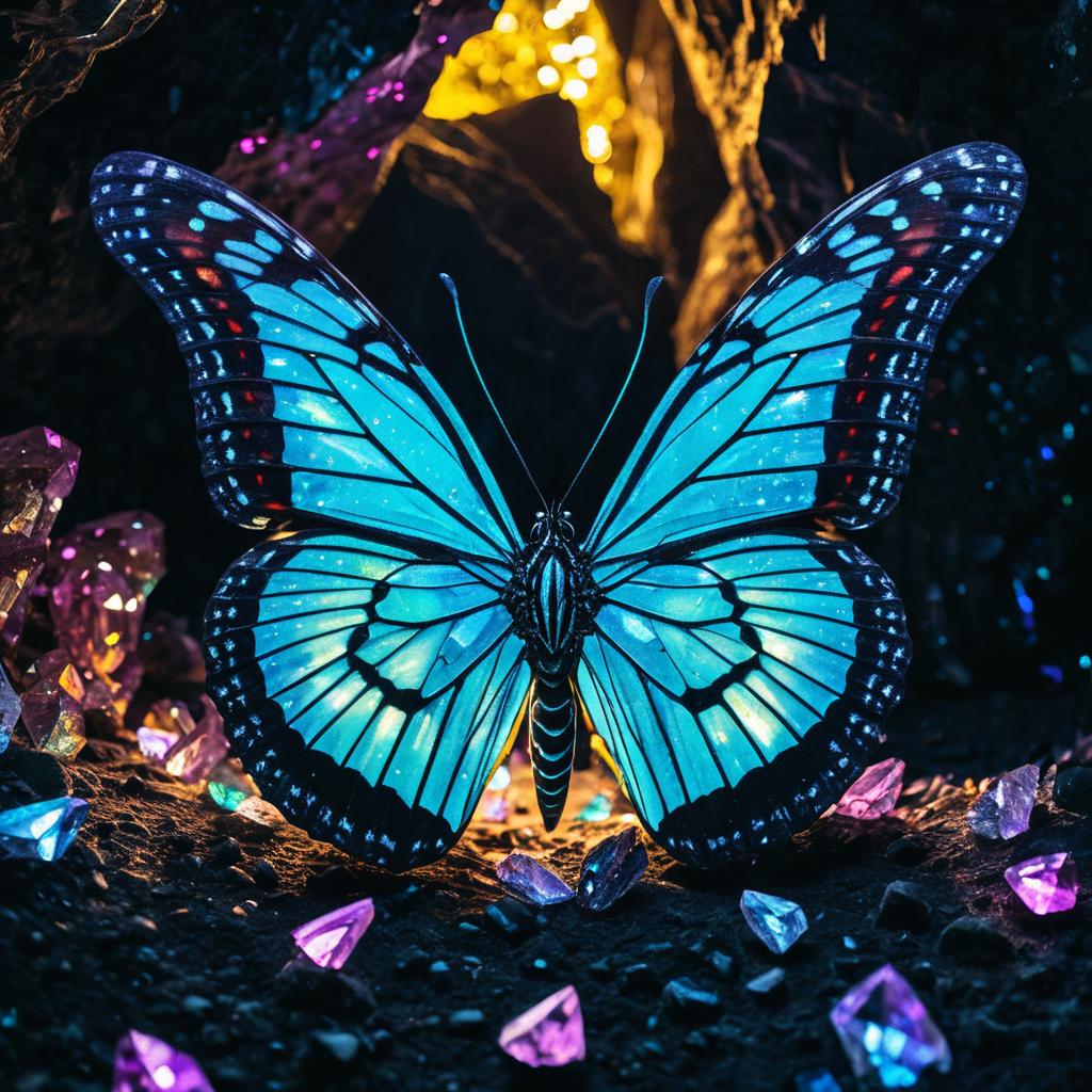 A surreal composition of a android butterfly, living in floating island covered with glowing crystals, glowing with chromatic shimmer and soft light trails, shot with Fujifilm, hyper-detailed, 32K resolution