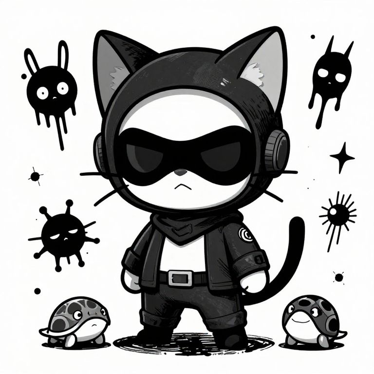 Chibi-style black cat in hooded jacket with sunglasses, standing confidently among black, bug-like creatures and two small, shell-eared creatures.