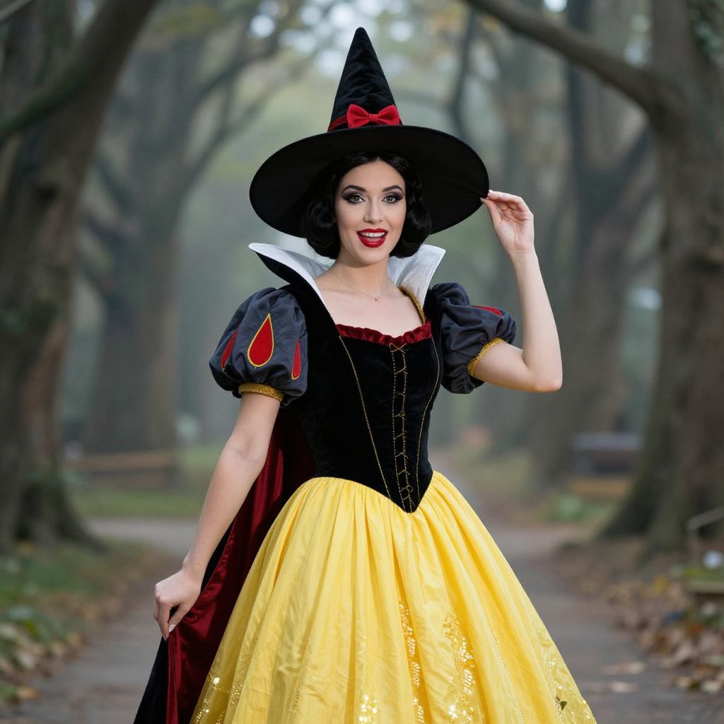 Snow White Wicked Witch Costume, woman wearing a black and yellow dress and a large hat