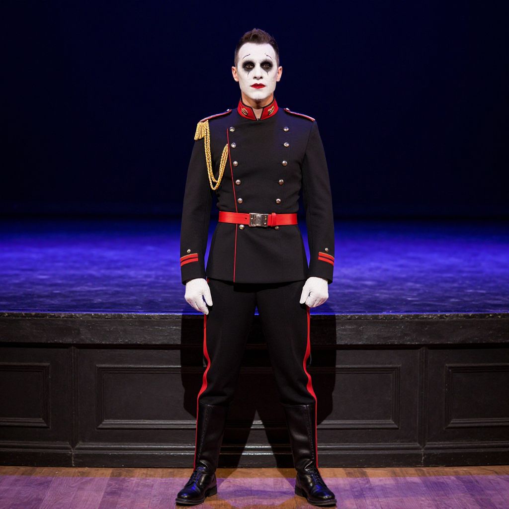 Photograph of a pale-skinned man with dark hair, wearing a black military-style uniform with red accents, gold epaulettes, and a red belt. His white-gloved hands hang by his sides. His face is starkly white with dark, dramatic makeup, creating a ghostly or theatrical appearance. He stands centered on a stage with a black, ornately carved wooden railing behind him and a blue-lit, gradient background. The floor is wooden, adding a warm contrast to the dark, formal attire. The overall style is dramatic and theatrical, evoking a sense of performance or presentation.