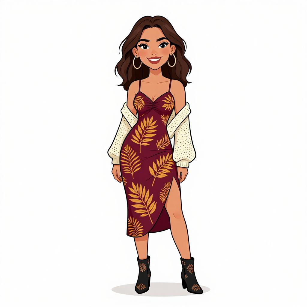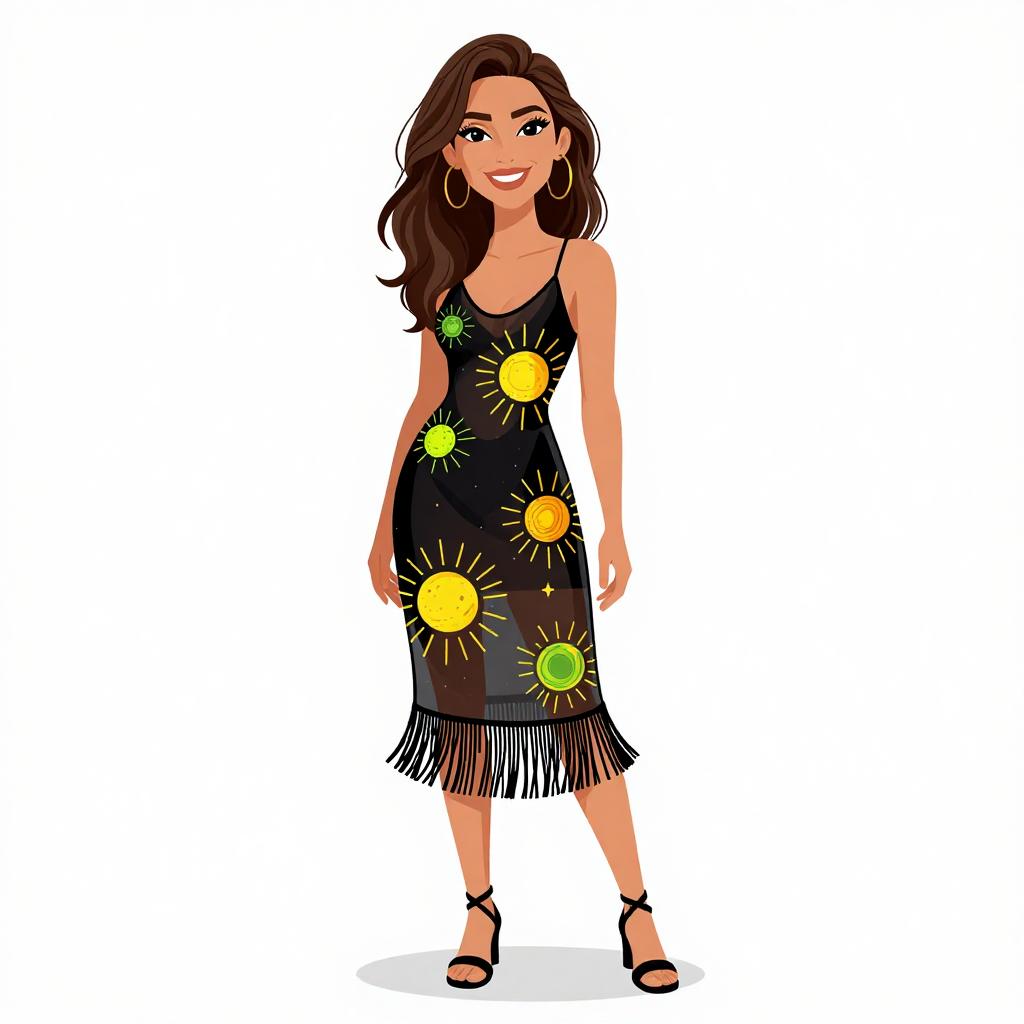 Woman with pretty face and pretty hair. smiling Woman, bohemian style, sheer black slip dress, scoop neckline, sleeveless, midi length, fringe trim at hem, embroidered yellow and green celestial designs on the front, casual strappy sandals, white background. --sref 1467