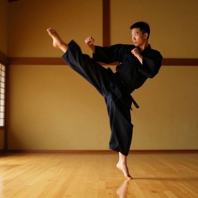 Combat pose of a martial artist in dojo, mid-air kick with flowing robes, precise form and strength, wooden floor reflection, warm lighting with traditional Japanese decor