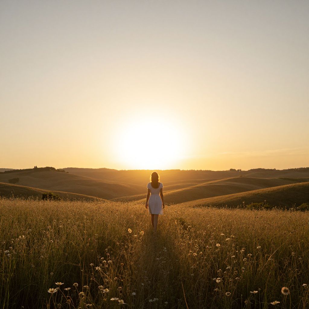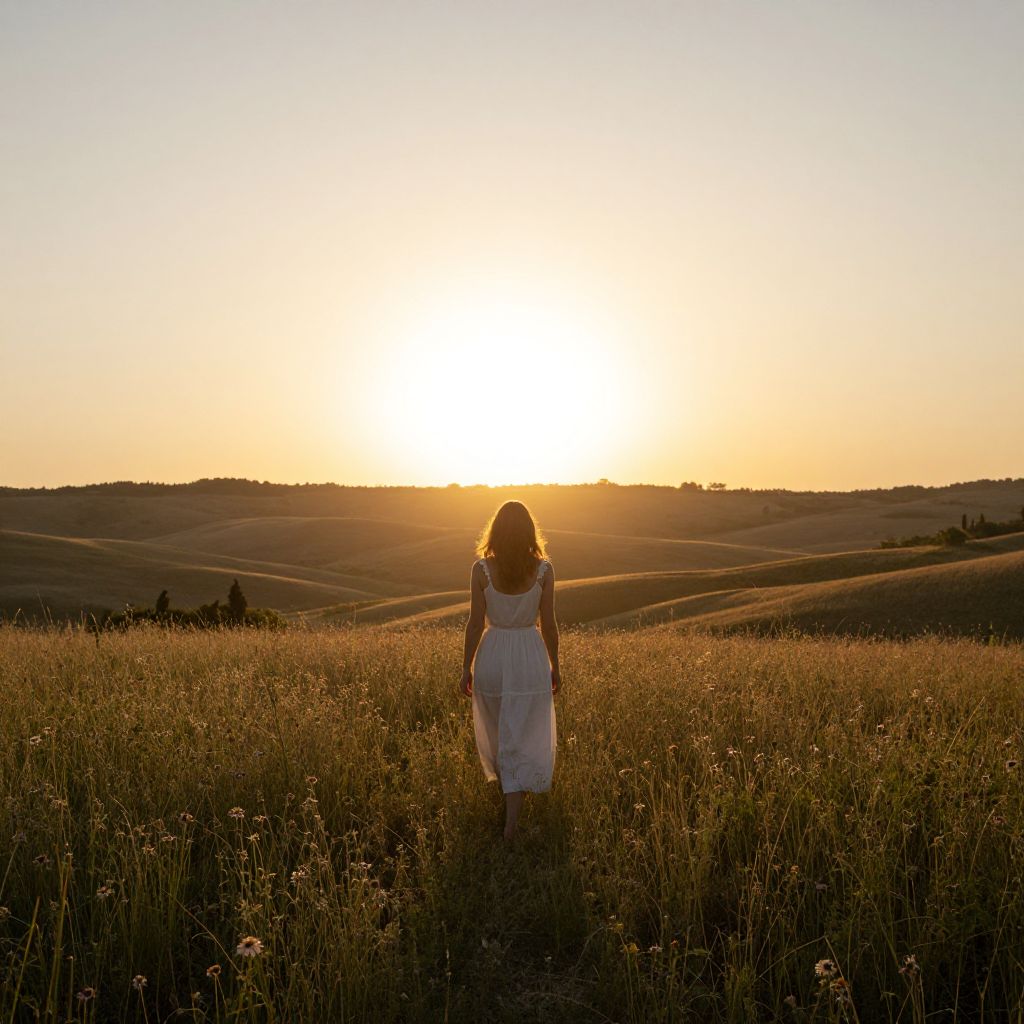 Amidst the golden embrace of Tuscany's rolling hills and wildflower fields, a woman walks toward the horizon, her silhouette bathed in the soft glow of sunset, embodying a profound sense of freedom, hope, and the timeless promise of love.