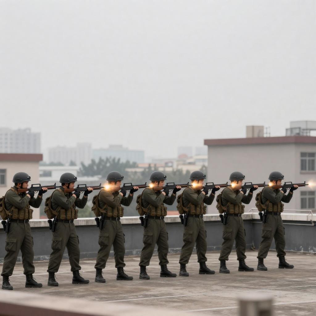 Armed Soldiers Firing from Urban Rooftop