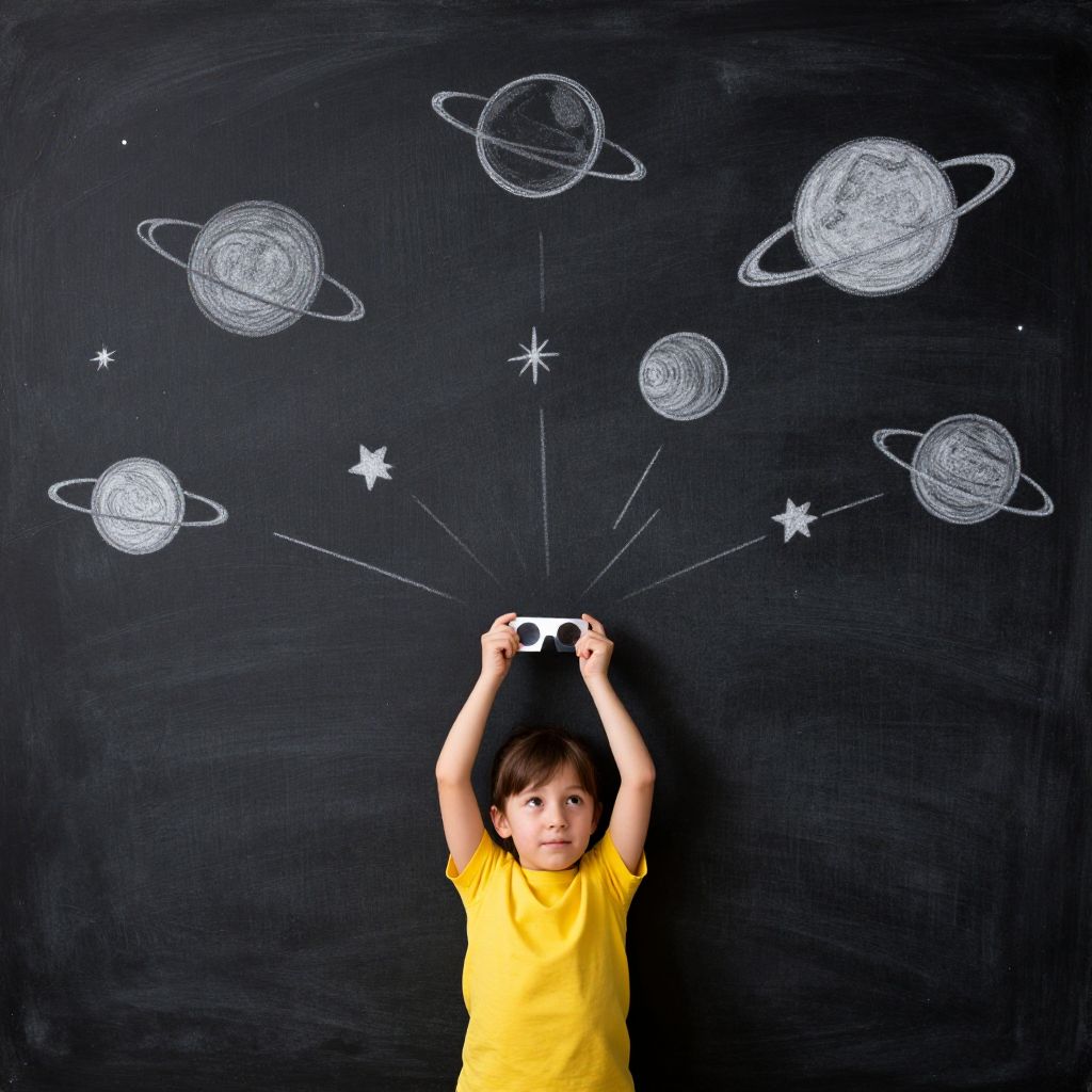 A child scribbles planets into existence on a blackboard sky during a solar eclipse, each new star blinking into tangent zones of alternative realities.