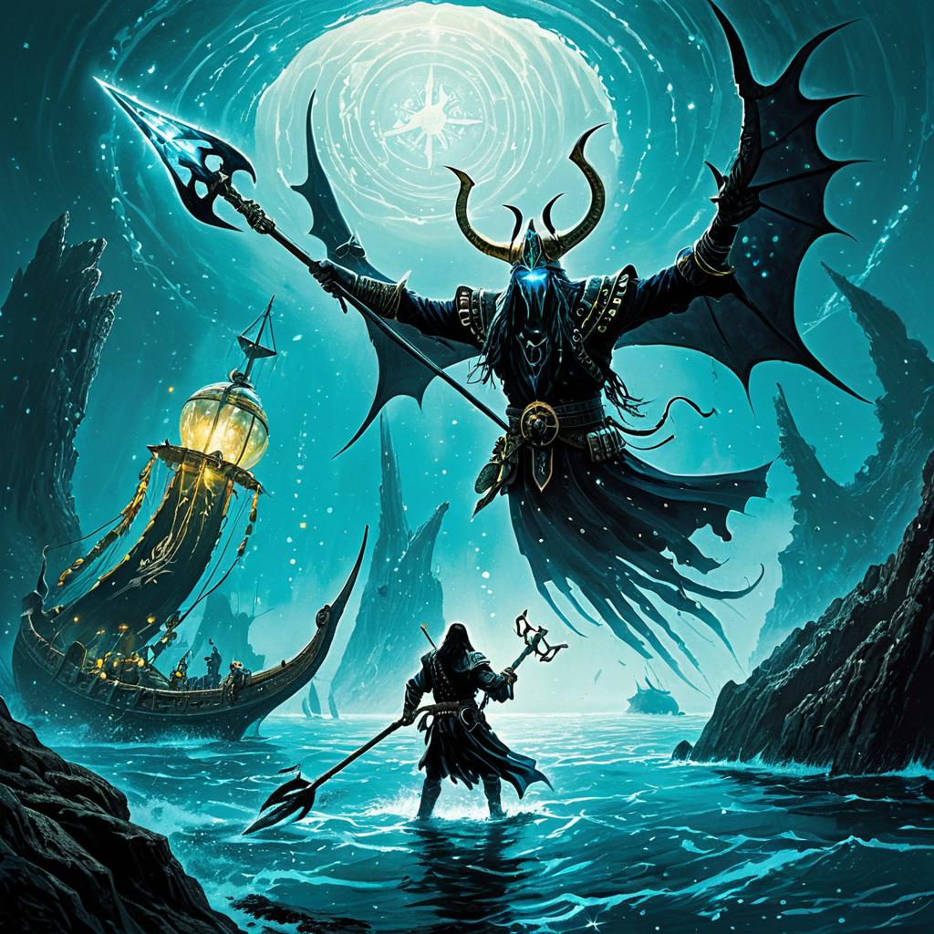 A serene hooded monk in a flowing black cloak swimming or walking underwater toward an enormous submerged glass dome. The dome is surrounded by ancient runes and symbols etched into corals and pillars. Rays of sunlight flicker through the water, illuminating the abyssal plain with coral formations and mystical glowing inscriptions on stone columns. The scene is depicted in an expressionist painting style, creating a dynamic and immersive fantasy underwater environment.