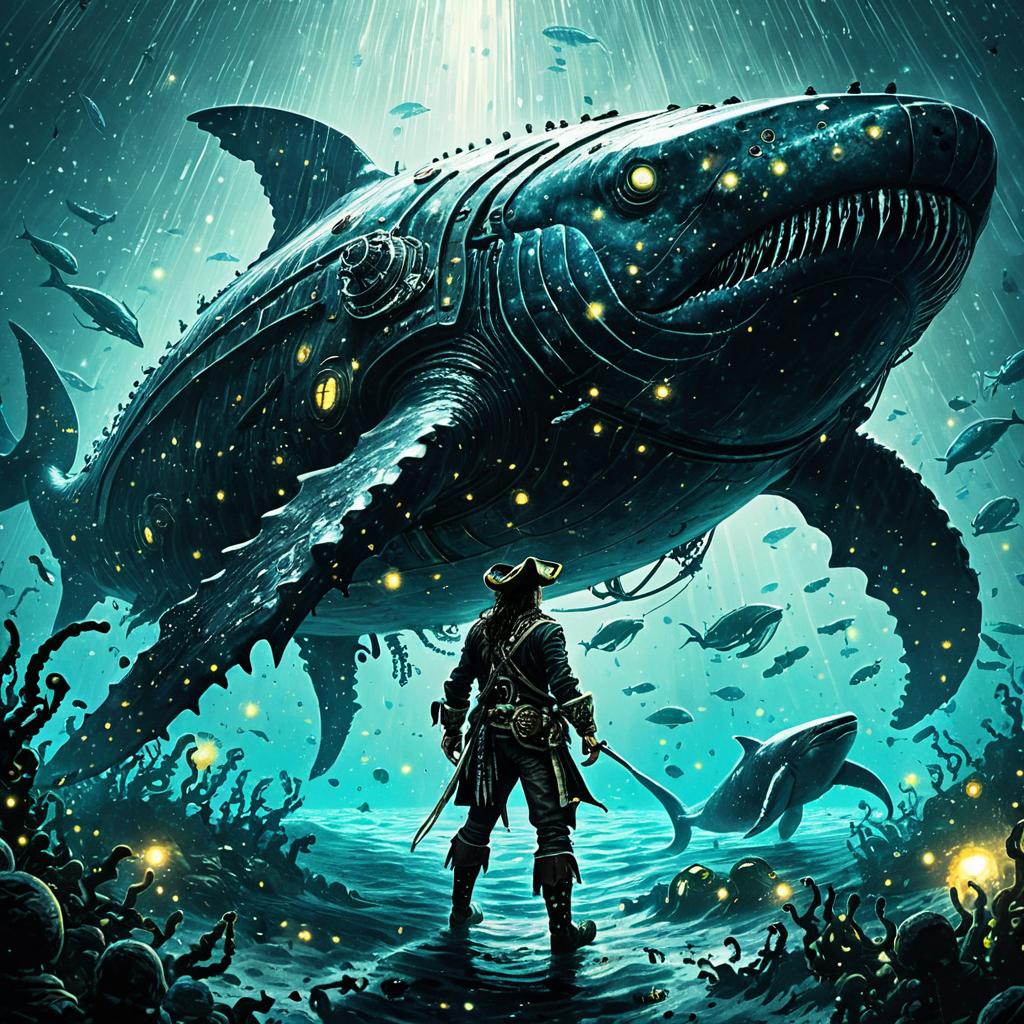 A serene sea monk with a hooded cloak swimming toward an enormous glass dome submerged abyssal plain, surrounded by glowing ancient runes etched on corals and flickering rays of sunlight, painted in expressionist painting style, dynamic and immersive
