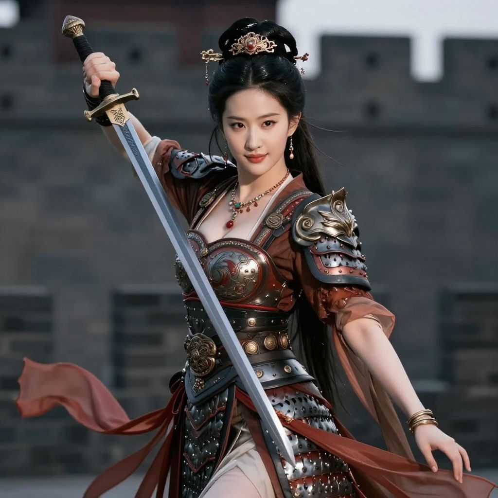 CR1.3, (flirtatious, seductive:1.4), (RAW photo:1.2), (photorealistic:1.6), (lens 135mm, f1.8:1.2), (ultimate quality, masterpiece:1.3), (intricate details:1.2), (detailed face:1.2), dramatic, ray tracing, fashion photograph, Full body, Sharp focus, cinematic lighting, perfection, perfect, perfection style, good hands, Fixhand, fFaceDetail, (ah1, BadNegAnatomyV1, anatomically correct hands, anatomically correct feet, anatomically correct body:1.6), liuyifei, wh_chi_armor, (1girl, solo, outdoors, war castle, holding sword, chinese sword:1.6), floating clothes, confident smile, beautful face, (large breasts, narrow waist:1.2), sexy body, perfect body, shiny hairs, zanhua, hair ornament, earrings, necklace, jewelry