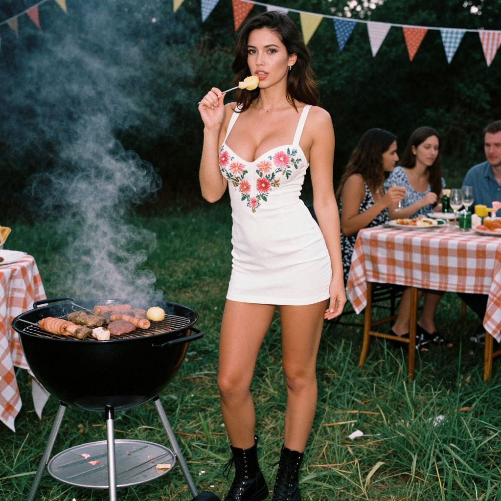 Photograph of a woman with long dark hair, tan skin, and a slim, toned physique, wearing a white, low-cut mini dress with floral embroidery and black ankle boots. She stands in front of a smoking barbecue, holding a skewer to her mouth. In the background, a group of four people sits at a table with a checkered tablecloth, engaged in conversation. Colorful triangular flags hang overhead, and the scene is set in a grassy outdoor area with trees. The overall atmosphere is casual and festive.