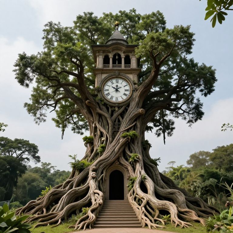 A colossal, sentient tree seamlessly integrates a grand clocktower into its gnarled trunk, its roots forming a natural staircase leading to a hidden doorway, where time and nature merge in a surreal, living tapestry.