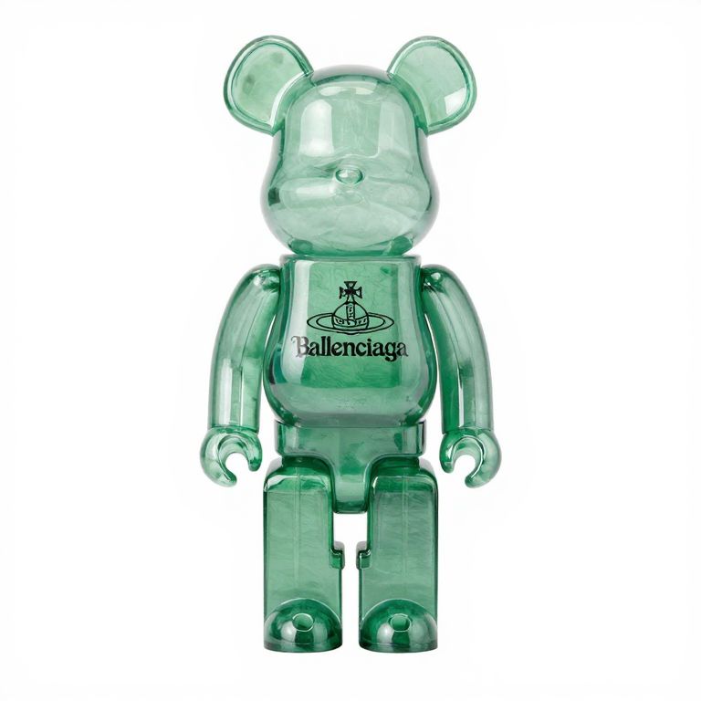 Photograph of a transparent, green plastic LEGO minifigure shaped like a bear with "Balletaga" logo on chest, standing upright.