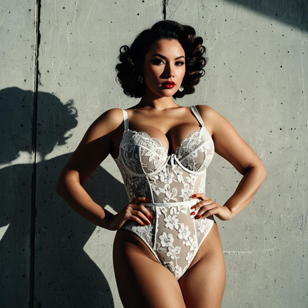 Lingerie Fashion, studio portrait of a stunning woman with big boobs. retro pin-up curls with classic red lips. She is wearing a burgundy lace bustier with garter straps. She poses confidentally against a plain white studio background. High fashion photography, photorealistic, 8k, intricate texture, sharp focus.