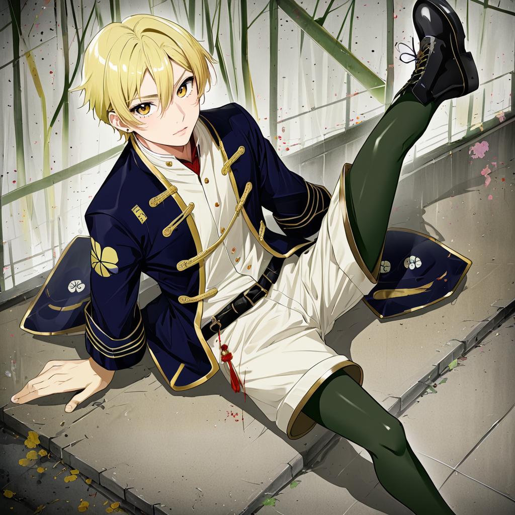 Monoyoshi sadamune, touken ranbu, 1boy, yellow eyes, blonde hair, pantyhose under shorts, lace-up boots, by artist suou-sensei, anime