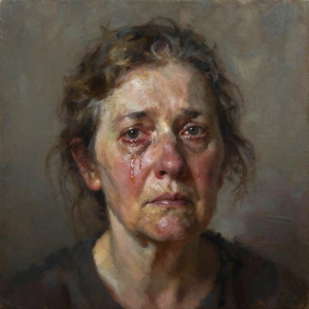 Very sad elderly woman, oil painting, tears streaming down cheeks, desaturated colors, moody lighting, high detail, realistic style