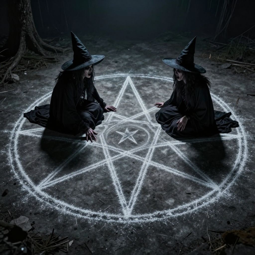 Photograph of two shadowy, witch-like figures in dark, tattered robes and pointed hats, seated on forest floor. They are casting a glowing white pentagram and hexagram, illuminated with magical energy, centered between them. The figures, with long, ragged hair and pale faces, are positioned facing each other within the mystical symbols. The background is a dense, dark forest with tree trunks partially visible, enhancing the eerie, mystical atmosphere. The glowing symbols create a stark contrast against the dark, textured ground. The image evokes a sense of ancient magic and mysticism.