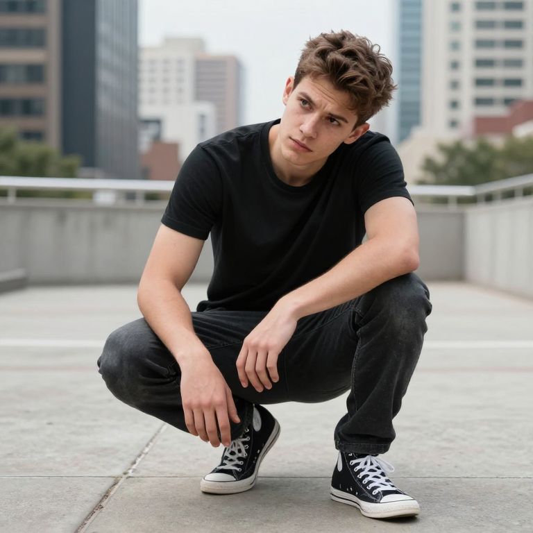 Photograph of a young Caucasian man with short, tousled brown hair, crouching on a concrete rooftop. He wears a plain black t-shirt, dark jeans, and black-and-white high-top sneakers. His expression is serious and focused, with slightly furrowed brows. The background features an urban skyline with blurred, tall buildings and some greenery. The lighting is natural, highlighting his fair skin and the textures of his clothing. The rooftop has a white railing, and the concrete appears smooth and grey. The overall style is casual and contemporary.