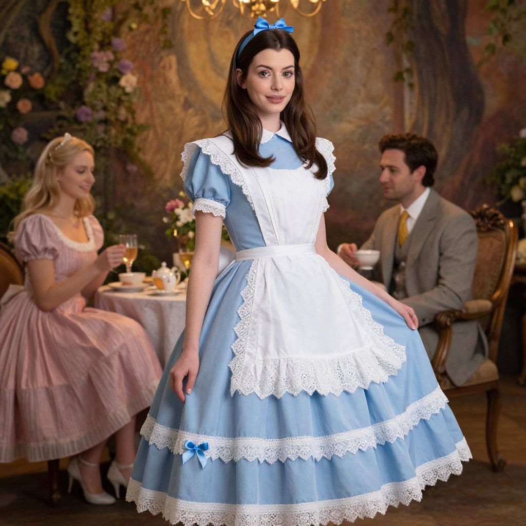 Alice in Wonderland costume inspired by Anne Hathaway, full Victorian-inspired blue dress with lace and ribbon details, mystical Wonderland setting featuring a tea party scene, warm golden light and rich textures evoking fantasy and elegance