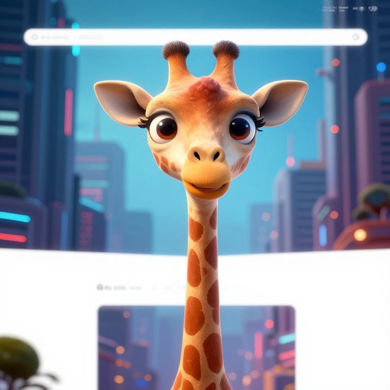 Stem imager website giraffe 3d hyperrealistic big eyes loveable cyberpunk backdrop and style show full body main subject near bottom of the image tall buildings and city behind,